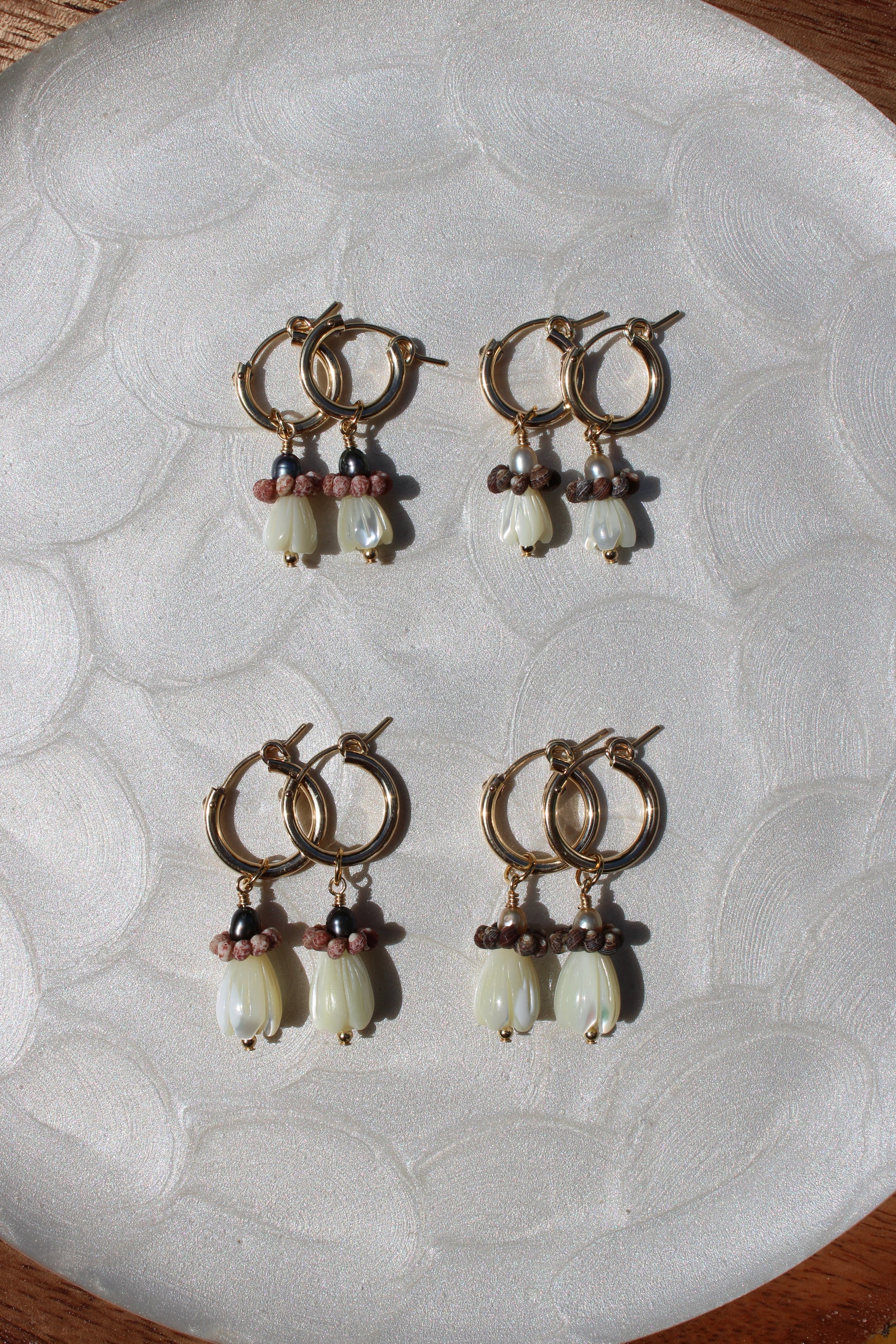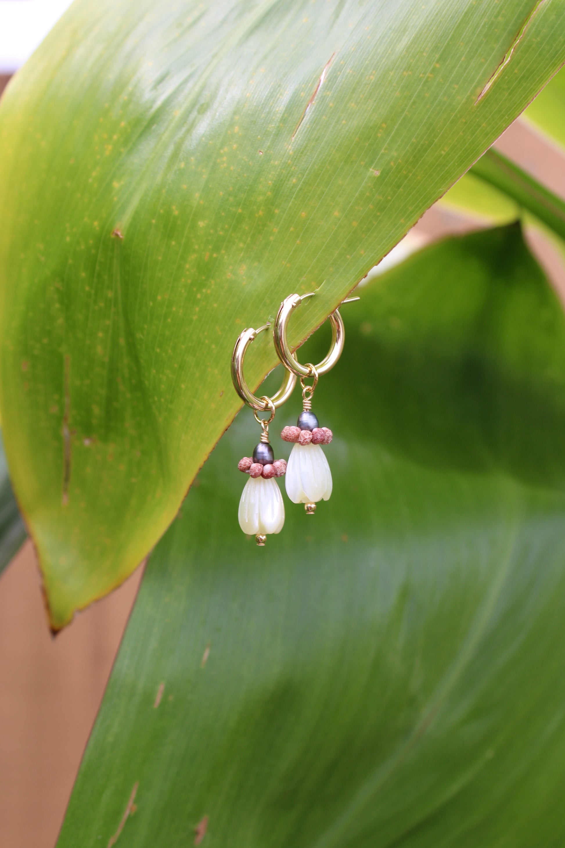 Kahelelani bloom huggies! Available with red/pink kahelelanis paired with dark freshwater pearls, or brown kahelelanis paired with light golden freshwater pearls, accented by small or medium mother-of-pearl pikake beads on a 13mm or 15mm huggie hoop. All kahelelani shells hand-picked on Oʻahu. Each piece is one of a kind; shell size and colors may slightly vary from the pieces shown.